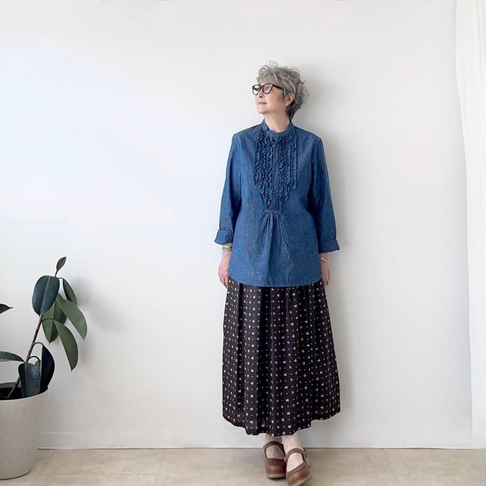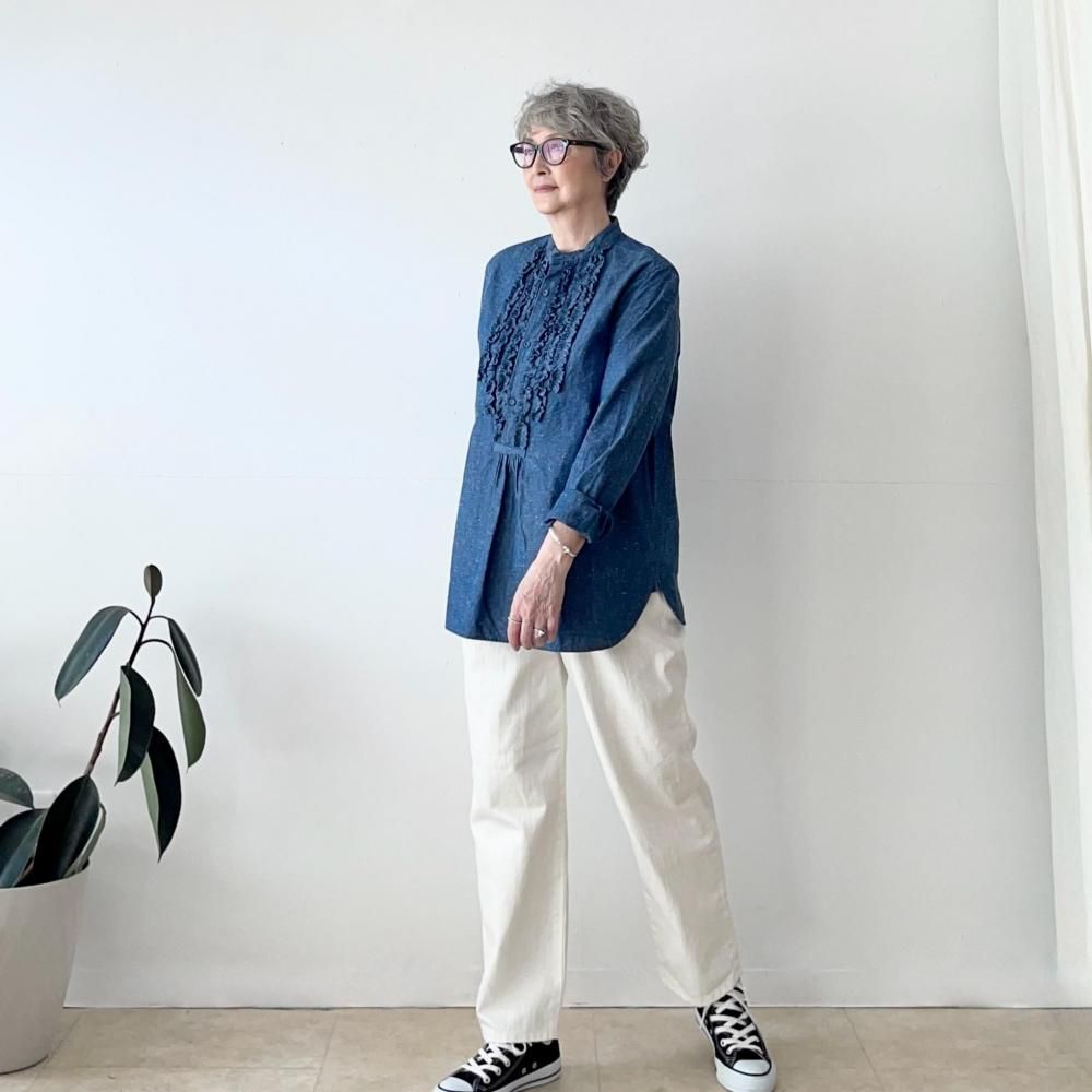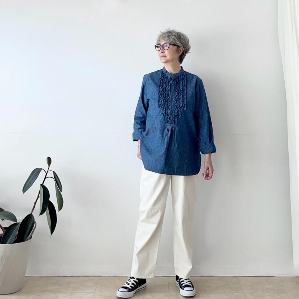 着心地の良いシャンブレー生地にフリルを施したブランド定番ラオスシャツ